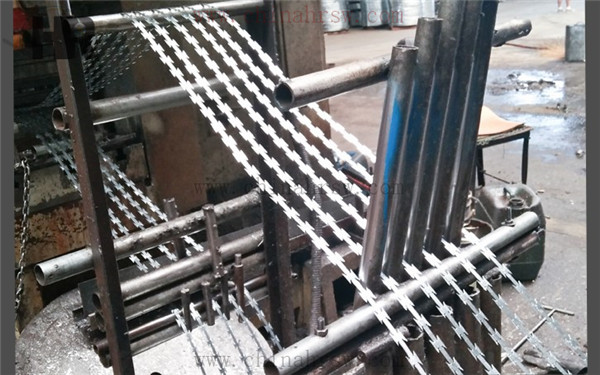 但是這種方式加工的刀片刺繩卻存在一個(gè)比較大的劣勢(shì),那就是由于缺乏支撐所以在固定方面比較困難。采用一種可以將其固定在邊框上的方式方法就顯得尤為重要了。這時(shí)刀片刺繩采用的連接方式一般為螺絲固定,因?yàn)楸砻婊蚴清冧\或涂塑在給其進(jìn)行焊接處理時(shí)造成了很大的困難,所以才使用了這種方式進(jìn)行固定,這種成本高,主要是尺寸都是客戶訂做的,沒有統(tǒng)一標(biāo)準(zhǔn),工人做活的時(shí)候效率低,不能大批量的生產(chǎn)。